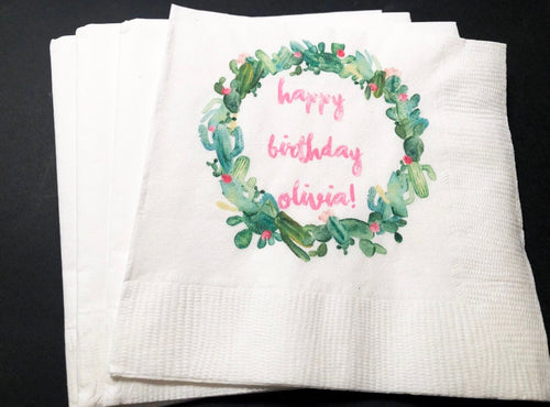 Cactus Succulents Birthday Fiesta Personalized Cocktail, Luncheon or Dinner Napkins Set of 25