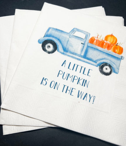 A Little Pumpkin Is On It's Way Blue Truck Fall Boy Baby Shower Pumpkin Autumn Baby Personalized Cocktail or Luncheon Napkins, Set of 25