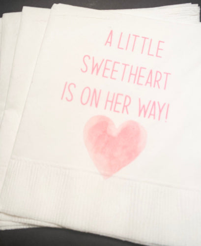 A Little Sweetheart is on Her Way Baby Shower Heart Valentines Girl Baby Shower Personalized Cocktail, Luncheon or Dinner napkins Set of 25