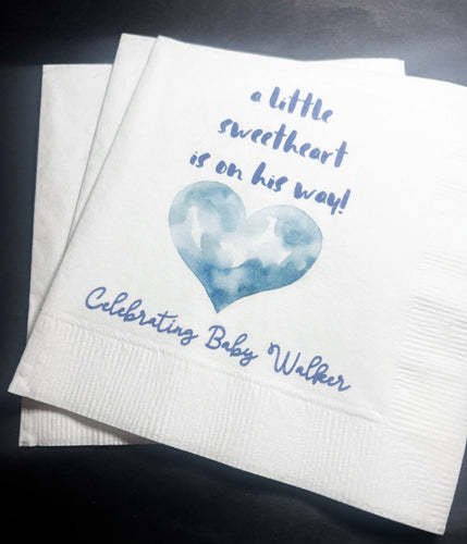 A Little Sweetheart is on His Way Baby Shower Heart Valentines Boy Baby Shower Personalized Cocktail, Luncheon or Dinner Napkins Set of 25