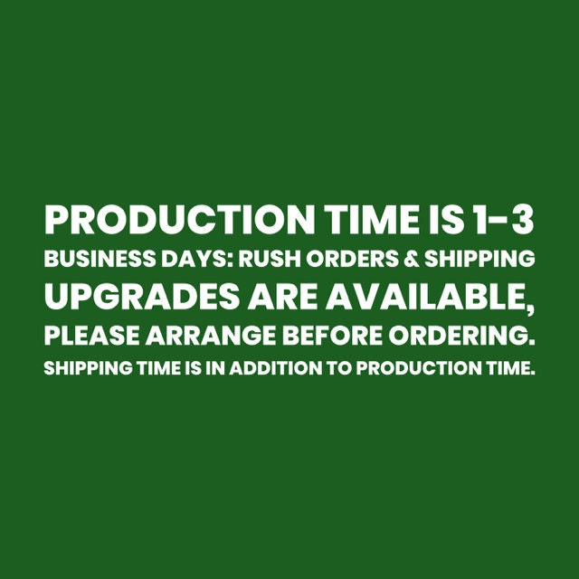 UPDATE 11-28-2022: CURRENT PRODUCTION TIME IS 1-3 BUSINESS DAYS FOR ALL ORDERS PLACED ON OR AFTER 11-28. PRODUCTION TIME BEGINS THE FIRST BUSINESS DAY AFTER ORDER IS PLACED, AND ORDERS ARE SHIPPED FIRST BUSINESS DAY AFTER PRODUCTION TIME. PRODUCTION TIME IS IN ADDITION TO SHIPPING AND DELIVERY TIME. IF YOU ARE NEEDING YOUR ORDER DELIVERED IN LESS TIME THAN THE ETA IS PROVIDING, PLEASE CONTACT SELLER *BEFORE* ORDERING TO ARRANGE A RUSH ORDER.
