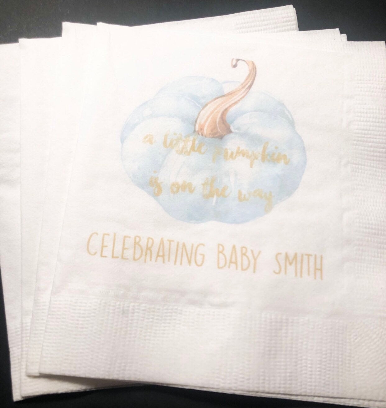 These cocktail napkins are perfect for that A Little Pumpkin Is On It's Way Boy Fall Baby Shower you are planning! These 3 ply cocktail napkins come in sets of 25, are approximately 5x5, and are printed with design and wording as shown. They are also available in luncheon or dinner size, which you can purchase by choosing this option in checkout, along with the quantity of sets you need.Please note these napkins come personalized as shown, and there are no other customization options at this time. If you have any questions about this item, please contact seller before ordering. Please also take special attention to production time and make sure and put your event date into notes when ordering.FAQ: