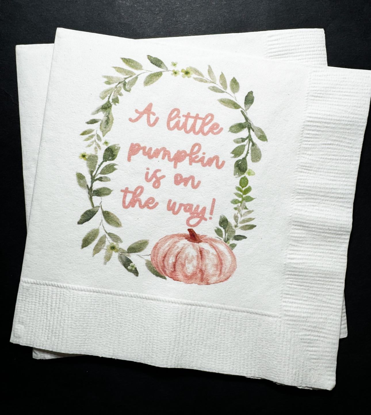These adorable pink pumpkin cocktail napkins are perfect for that A Little Pumpkin Is On It's Way Girl Fall Baby Shower you are planning! These 3 ply cocktail napkins come in sets of 25, are approximately 5x5, and are printed with design and wording as shown. They are also available in luncheon or dinner size, which you can purchase by choosing this option in checkout, along with the quantity of sets you need. Please note these napkins DO NOT come personalized and there are no other customization options at this time. There are many personalized versions of this napkin listed in the shop if that is what you’re looking for! If you have any questions about this item, please contact seller before ordering. Please also take special attention to production time and make sure and put your event date into notes when ordering.FAQ: