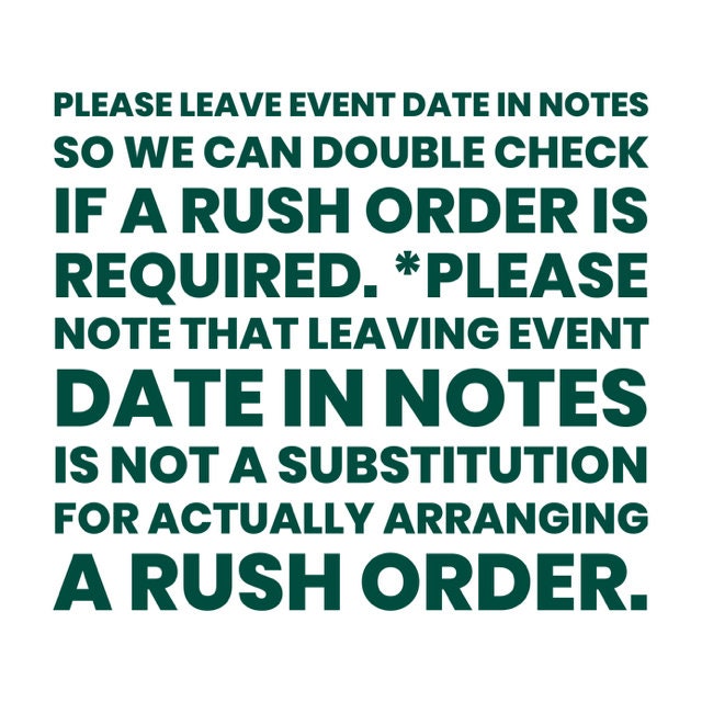-I put my event date into notes like you requested, does this guarantee my item will be delivered by that date? No 😊 The only way to guarantee a delivery date is to arrange a proper rush order with us *before* ordering, giving us the opportunity to confirm we can accommodate and you paying the appropriate rush fee.
