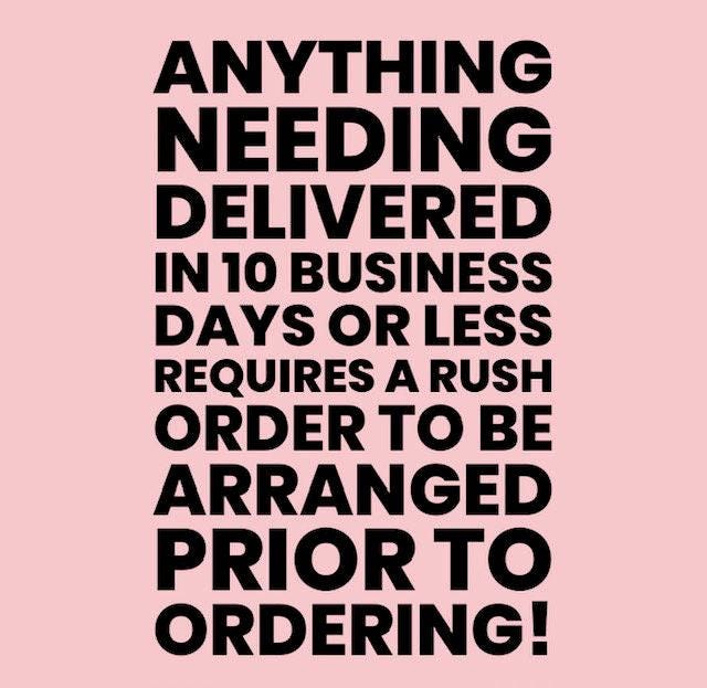 -I need this before a certain date, can you accommodate? All of our items are needed for a specific event date, as these are special occasion items, so we are very sensitive to our customers’ event dates. We do everything we can to meet your needs, but we must know the event date in order to confirm we can accommodate, and sometimes a rush order is required, which does come with a fee. In general, anything needed to be delivered in 7 business days or less, starting the first business day after ordering, requires a rush order to be arranged *prior* to ordering. If you are unsure if you need a rush, please message us *before* ordering, doing so after ordering causes both parties more confusion. If you know you need a rush, please message us before ordering also, so we can make sure you pay the correct fee. Thank you for your help with this!