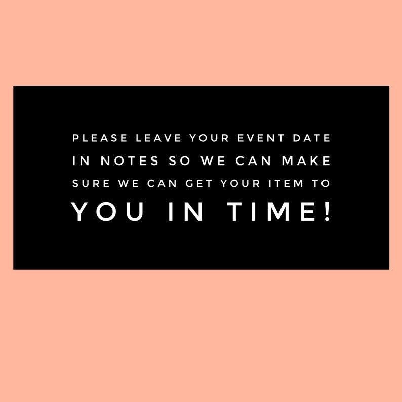 -I put my event date into notes like you requested, does this guarantee my item will be delivered by that date? No 😊 The only way to guarantee a delivery date is to arrange a proper rush order with us *before* ordering, giving us the opportunity to confirm we can accommodate and you paying the appropriate rush fee.