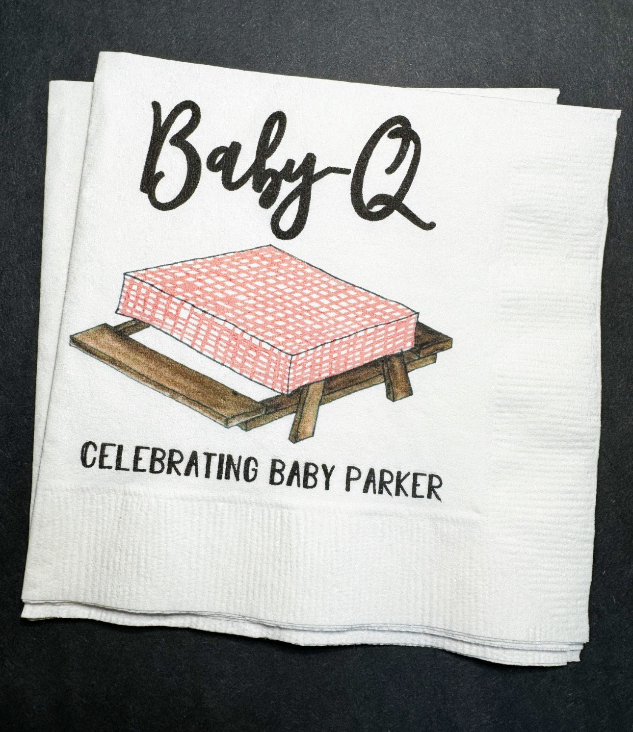 These personalized cocktail napkins are perfect for that Baby-Q Baby Barbecue Baby Shower you are planning! These 3 ply cocktail napkins come in sets of 25, are approximately 5x5, and are printed with design of pink tablecloth and table and wording as shown. They are also available in luncheon or dinner size, which you can purchase by choosing this option in checkout, along with the quantity of sets you need. Please note these napkins come personalized as shown, and there are no other customization options at this time. If you have any questions about this item, please contact seller before ordering. Please also take special attention to production time and make sure and put your event date into notes when ordering.