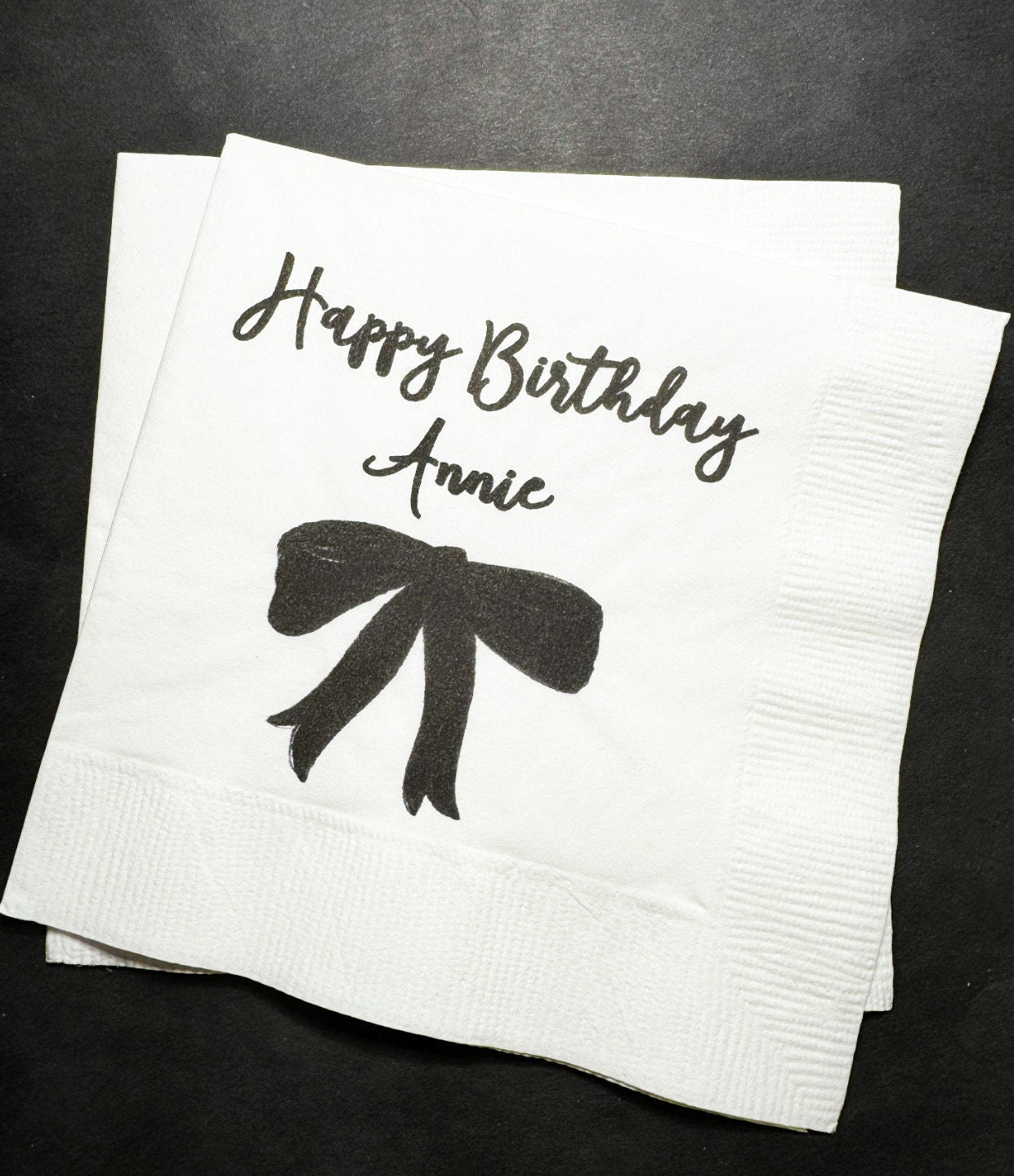 These pretty cocktail napkins are perfect for that Black Bow or Hello Forty 40th Birthday you are planning! These 3 ply cocktail napkins come in sets of 25, are approximately 5x5, and are printed with design as shown. They are also available in luncheon or dinner size, which you can purchase by choosing this option in checkout, along with the quantity of sets you need. Please note these napkins come as shown, personalized with one name of your choice-everything else remains the same- and there are no other customization options at this time. If you have any questions about this item, please contact seller before ordering. Please also take special attention to production time and make sure and put your event date into notes when ordering.FAQ: