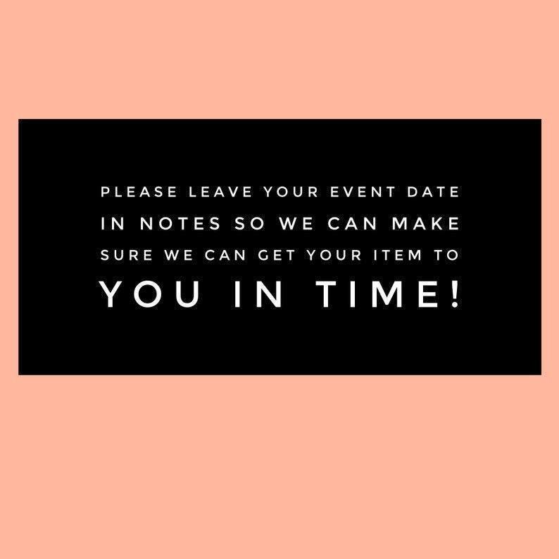 -I put my event date into notes like you requested, does this guarantee my item will be delivered by that date? No 😊 The only way to guarantee a delivery date is to arrange a proper rush order with us *before* ordering, giving us the opportunity to confirm we can accommodate and you paying the appropriate rush fee.