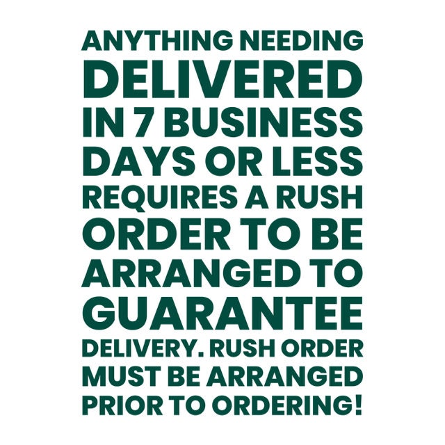-I need this before a certain date, can you accommodate? All of our items are needed for a specific event date, as these are special occasion items, so we are very sensitive to our customers’ event dates. We do everything we can to meet your needs, but we must know the event date in order to confirm we can accommodate, and sometimes a rush order is required, which does come with a fee. In general, anything needed to be delivered in 7 business days or less, starting the first business day after ordering, requires a rush order to be arranged *prior* to ordering. If you are unsure if you need a rush, please message us *before* ordering, doing so after ordering causes both parties more confusion. If you know you need a rush, please message us before ordering also, so we can make sure you pay the correct fee. Thank you for your help with this!