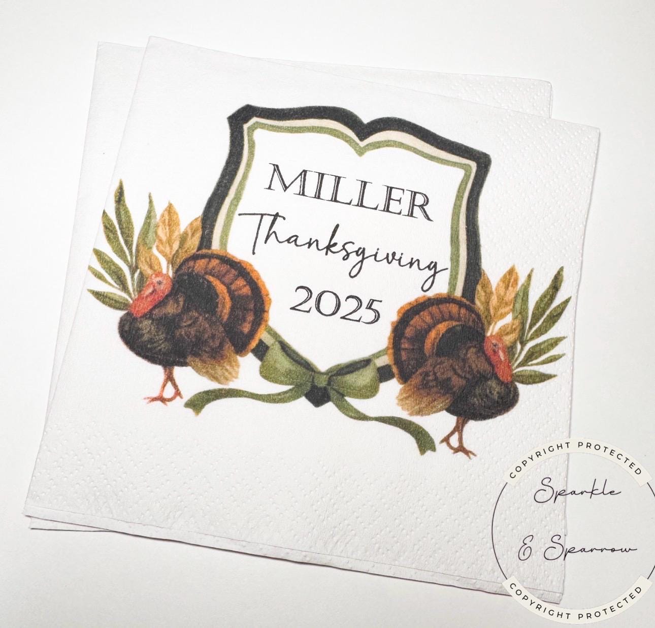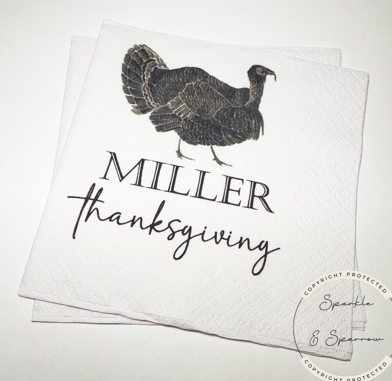 These beautiful personalized farmhouse turkey style Thanksgiving themed cocktail napkins are perfect for that Thanksgiving, Thanksgiving Dinner or other Thanksgiving turkey themed event you are planning! They are also available in luncheon or dinner size, which you can purchase by choosing this option in checkout, along with the quantity of sets you need. Please note these napkins come personalized as shown, with one name of your choice, everything else remains the same, and there are no other customization options at this time. If you have any questions about this item, please contact seller before ordering. Please also take special attention to production time and make sure and put your event date into notes when ordering.